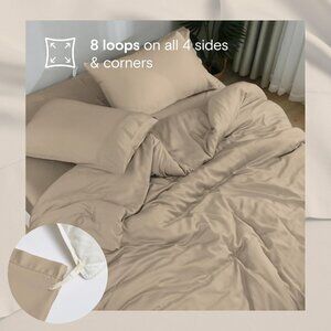 This cooling Twin/Twin XL duvet cover set is made from 100% bamboo viscose for breathable comfort year-round. Features a buttery-soft sateen weave, high 145 GSM weight, and 8 interior loops for secure duvet attachment. Includes 1 duvet cover and 1 pillowcase in a warm dune color.