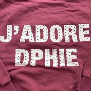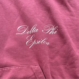 Hoodie size L (oversized fit), with front pocket, script ‘Delta Phi Epsilon’ and ‘J’ADORE DPHIE’ on back