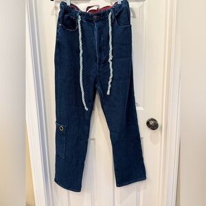 P68 a 5 Pocket, Relaxed Fit with Slight Taper Bottom, Elasticated Waistband with a Braided Hemp Rope Self-Tie Belt. Made in 100% Cotton 12oz Natural Indigo Dyed Japanese Sashiko. Additional P68 Details: