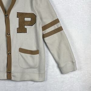 DR Essentials Mens L Ivory Tan Fleece Varsity Letter Cardigan Sweater College Preppy Collegiate University Classic