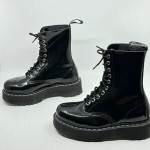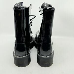 Details: Black patent leather 10-eye lace-up platform boots with airwair bouncing soles.