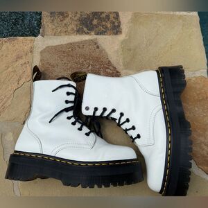 Step up your look with these iconic Dr. Martens Jadon platform boots — the perfect mix of edgy and timeless. Crafted in white polished smooth leather, these 8-eye boots feature the classic yellow welt stitching, black grooved platform sole, and side zip for easy on/off. Only worn once; uppers and soles show virtually no wear. Comes in original box.