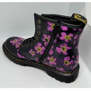 A floral uprising. These vibrant junior boots showcase a colorful silk-screen-style print from our new collection, but scale it down for young DM's fans. Built from high-shine Patent Lamper leather for maximum impact, the boots stay true to our Original 8-eye design with yellow stitching and our classic AirWair heel loop. Set on a lighter-weight edition of our air-cushioned sole, they're fitted with a side zip for easy access and finished with antique gold eyelets.