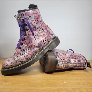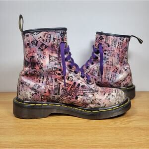 The Dr. Martens Pink London Icons Leather Boots in size 5 UK (US size 7) are stylish ankle boots with a round toe, lace-up closure, and low block heel. Made in England, these vintage boots feature the iconic London Icons pattern on leather material, showcasing a unique blend of pink, blue, purple, black, and white colors. With a 7-inch shaft height and rubber outsole, these boots are perfect for casual occasions and add a touch of British flair to any outfit. Made by the renowned brand Dr. Martens, these boots are a timeless piece that combines style and comfort.