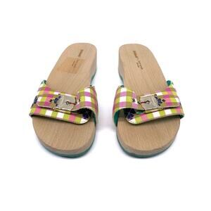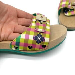 Dr. Scholl's X Kate Spade Collaboration, New York Bella Plaid Slide Sandals in pink, green, and white, with a light beechwood sole, rubber outsole. Round toe, slip on style, adjustable strap across the toes. Spade flowers on the plaid, metal heard studs on the edges. Great condition!