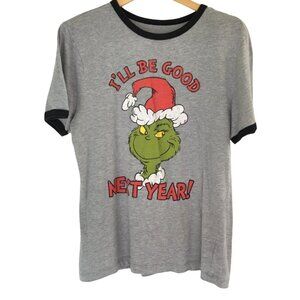 DR. SEUSS men's small pajama set includes a short sleeve crew neck top and fleece bottoms in a mix of black, grey, red, and green. This set is made from a comfortable cotton/polyester blend.