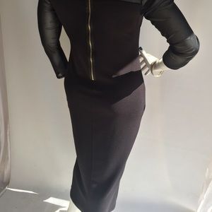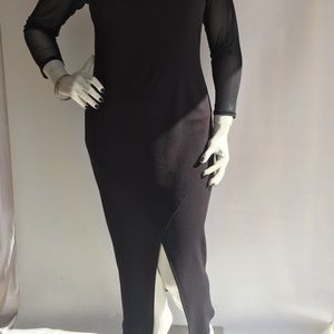 DR1187-Black sheer top maxi length flared with sheer long sleeve dress. A metal zipper to close dress on the back of this great dress!!