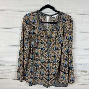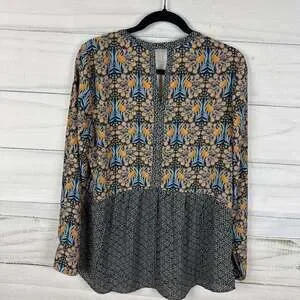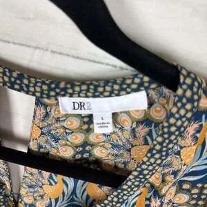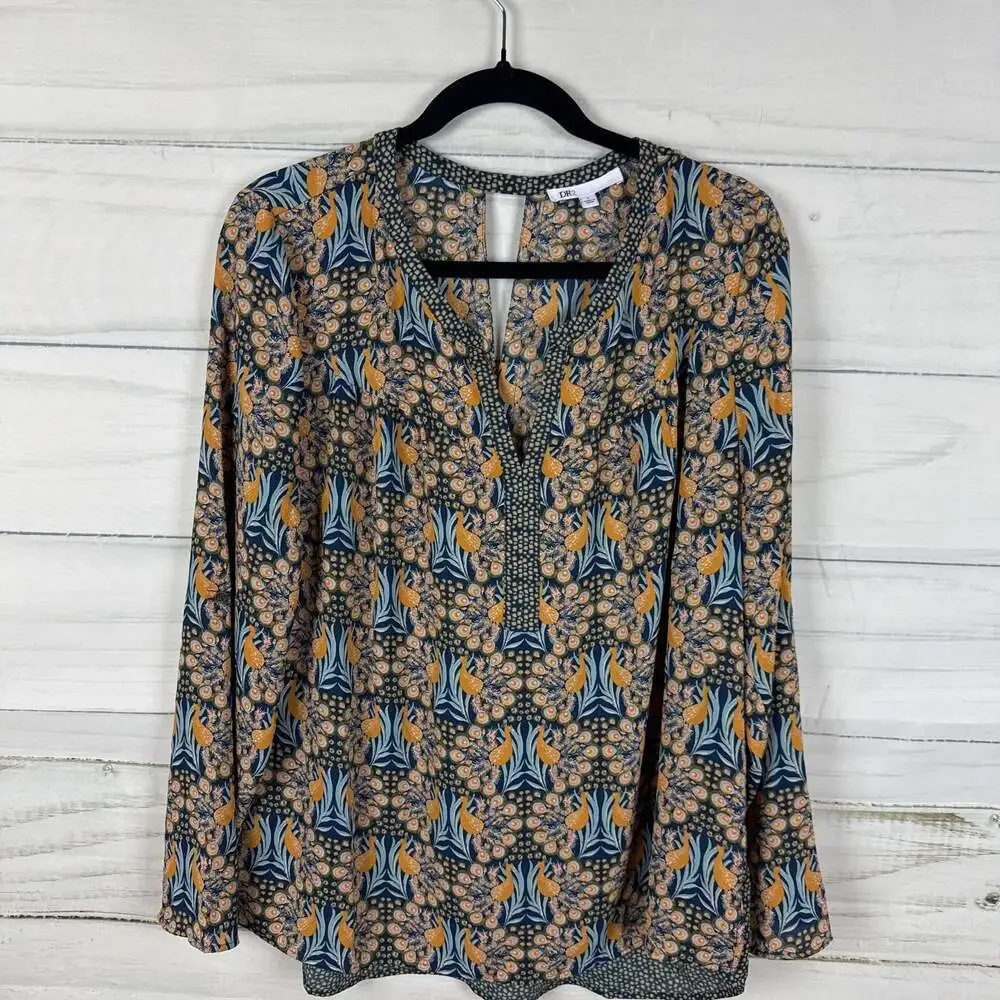 DR2 Peacock Print Blouse, Boho Split Neck, Size L — Lightweight and stylish.