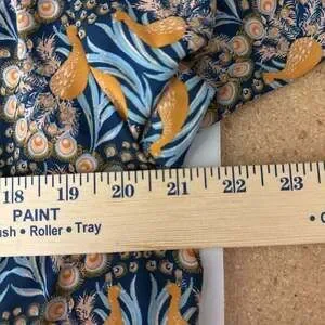 This long sleeve top features a vibrant peacock and floral motif in shades of blue and mustard yellow. It is designed with a V-split neckline and a keyhole back detail. The flowy silhouette makes it perfect for office wear or a casual weekend look.