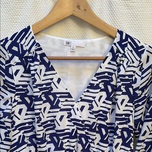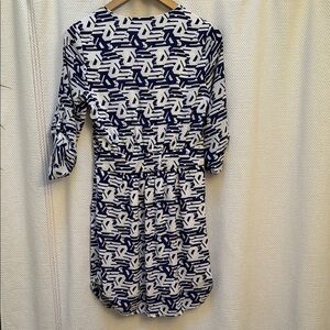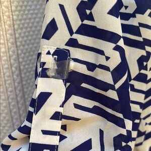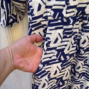 Elegant blue and white dress with pockets. Perfect for a stylish look. One callout, missing button on sleeve, currently in place with fashion tape. 🤣