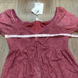 Elegant maroon blouse with puff sleeves. Features a ruched front and subtle shimmer. Smocked bust and sheer sleeves. Fully lined. NWT