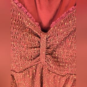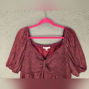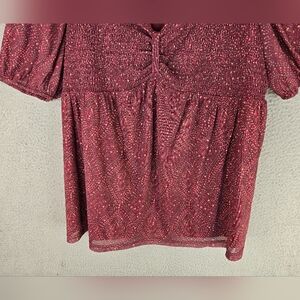 This is a Daniel Rainn women's peplum blouse made of chiffon material. The blouse features a maroon pink dot pattern, short puff sleeves, and a V-neckline. It has a smocked bust and a gathered accent at the bust. The blouse is lightweight, lined, and machine washable. It is suitable for travel, party/cocktail, casual, and business occasions. The blouse is in size XL and has a regular fit. The blouse has a festival, Bohemian, date night, and summer theme.