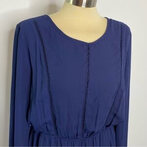 DR2 dark blue dress. Blouson style top with ladder stitch inset trim, elastic waistline, long sleeves with elastic cuffs. Hidden pockets in skirt, dress is fully lined. Worn once for family photos for a few hours, sadly too big on me now. Please note, dress is a size XL, the size tag fell off when laundering.
