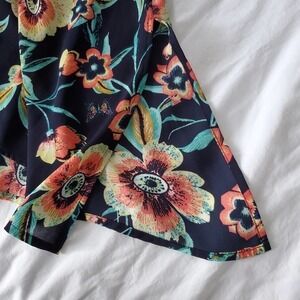 DR2 floral asymmetrical sleeveless top. V neck with a small loop & button closure, and ruffle trim that cascades together down the front. Asymmetrical side has a partial slit. Very soft material