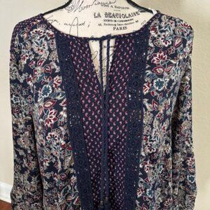 Beautiful florals and mini paisleys with lace trim and tassel ties. This lightweight pullover has a V neckline, rounded hem and a relaxed fit. There are long puff sleeves that can be rolled up with a button strap. 100% polyester. EUC - no signs of wear!