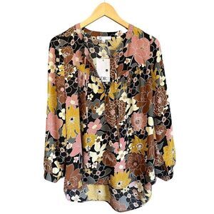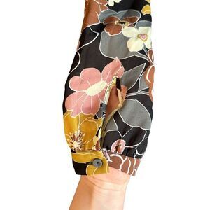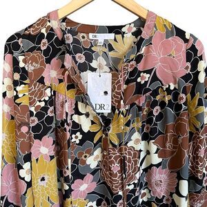 DR2 Floral Tie Front Cuffed Sleeve Floral Flowy Light & Airy Peasant Blouse New With Tags Size Small (Sleeves can be cuffed to 3/4 length with button.