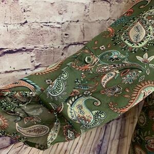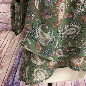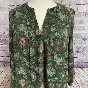 DR2 Green Paisley Print Semi Sheer Roll Tab Sleeve Blouse