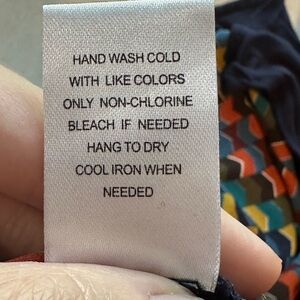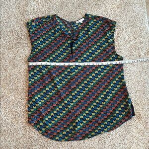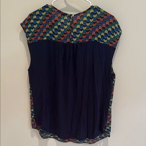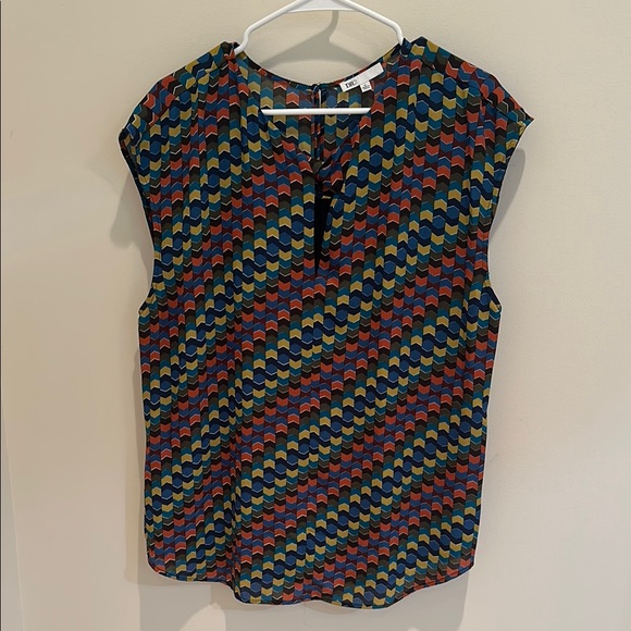 DR2 patterned blouse featuring multiple colors, including shades of blue, green, orange, maroon, and yellow. Size XL. Good, pre-owned condition.