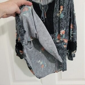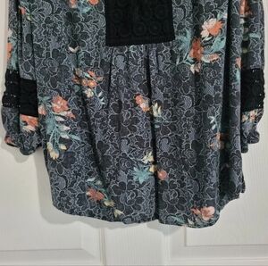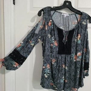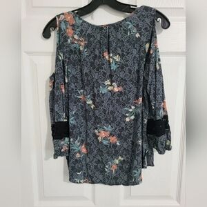 This is a DR2 open shoulder blouse/shirt. Women's size small, loose fitting. The style has a multicolored black, green, and orange floral print with a black knitted area down the front and bottom of sleeves. The material is a soft lightweight t-shirt material with a slight stretch. The shirt is used but is still in good condition with a lot of life left. Has a little bit of wash-wear and fading but no holes or stains.