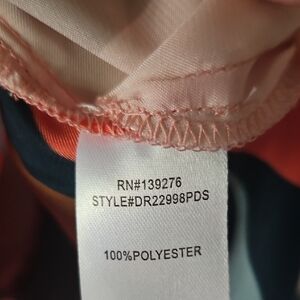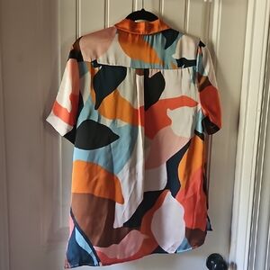 Stunning,artful button-up shirt with abstract design. Features orange, blue, black, and brown hues.2 front pockets with back pleat.