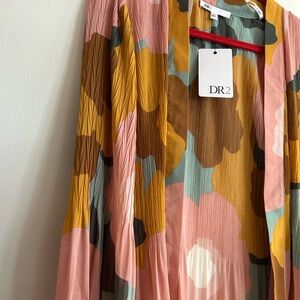 Chic DR2 duster with bold graphic patterns. Features pink, brown, and green tones. Length-37”