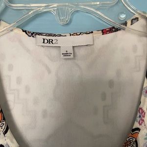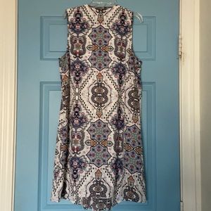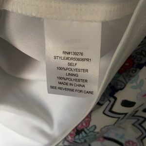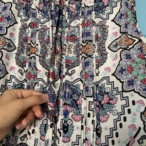 Pretty white patterned dress for sale. The front half is button up but the buttons are concealed by the pleats in the front. This fits between a small and a medium. It’s in excellent condition, comment for measurements or with questions.