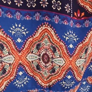 The DR2 blouse features a striking combination of deep purple and vibrant orange geometric patterns, accentuated by a mandarin collar. Its boxy style offers a relaxed fit, while the intricate central panel and contrasting border add a unique touch to the design.