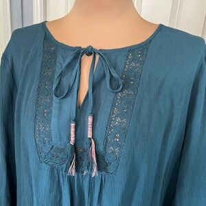 DR2 Teal Green Boho Peasant Top with Lace Accent & Tassel Tie