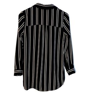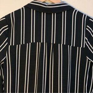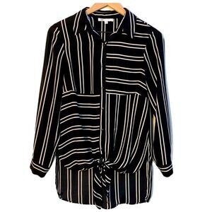 DR2 Tie Front Blouse Women’s XS Black White Block Stripe High Low Button Up.