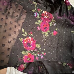 Features soft black velvet bodice with sheer floral dotted mesh peplum hem and sleeves