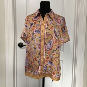 DR2 Womens Shirt S Yellow Paisley Satin Collared Short Sleeve Button Up NWT