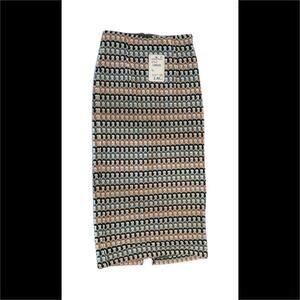NWT DR2 by Daniel Rainn women's midi skirt in Size Small. This stylish skirt features an eye-catching gray crochet stripe pattern, a flattering midi length, and an easy pull-on style. The textured knit is soft, comfortable, and perfect for adding a touch of bohemian-chic to your wardrobe. New with tags, ready to wear for work, weekend, or a vacation.