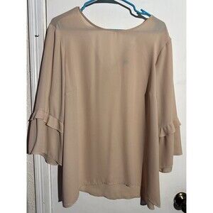 DR2 by Daniel Rainn Woman's Peach Long Sleeve V-Neck Blouse, size XL. This chiffon blouse features ruffled cuffs and a V-neckline with a hidden snap closure for adjustable coverage. Made from 100% polyester, it is lightweight and breathable. In excellent pre-owned condition, with no stains or holes. Hand wash cold, hang to dry. 931