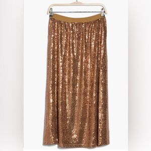 DR2 by Daniel Rainn Sequin A-Line Midi Skirt Copper Rose Size Large. Sparkling sequins elevate a graceful A-line skirt that adds a touch of shine to all your party outfits. 32" length. Elastic waist has stretch. Lined. 100% polyester. Hand wash, line dry. New with tags.