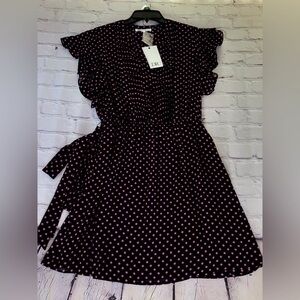 DR2 women pm black pink polka dot flutter short sleeves tie elastic waist mini dress v- neck NWT see photos for further details and measurements offers are welcome bundle and save from a smoke free home