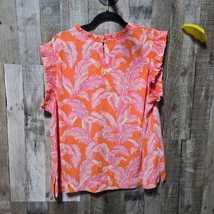 Details: all over print, high neck, built in lining, lightweight, ruffle sleeve, keyhole button back