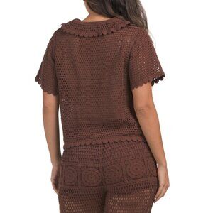 crochet design, faux pearl button accents, scalloped trim, unlined