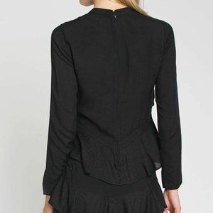 DRA Clothing Constantine Top Combining elements of cascading, textured dobby ruffles and subtle peplum hemline, this long sleeve Constantine top embodies a chic, layered look with a touch of formal flair. Cut in a soft Black, this blouse is that perfect transitional piece that will quickly become a new wardrobe staple. 100% viscose Hand wash cold