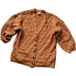 Textured cardigan is a soft mustard yellow knit. Subtle lantern sleeves , dual front welt pockets and shell buttons. 55% viscose, 40% nylon, 5% pbt Oversized fit Retail $168