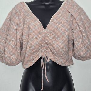 DRA Los Angeles Plaid Crop Top Size Medium Cinched Balloon Sleeves