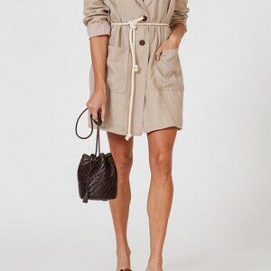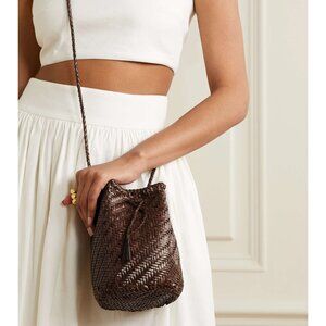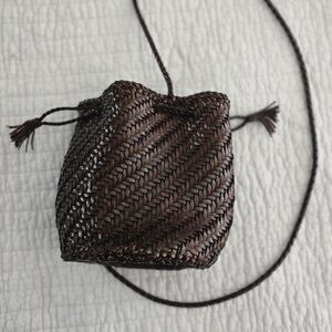 This bucket bag by Dragon Diffusion features hand-crocheted soft goat leather, a long shoulder strap and a drawstring closure. An antiqued St. Christopher medal charm is hand-sewn inside the main compartment. GUC.