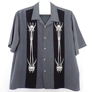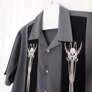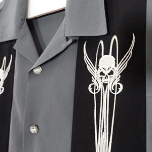 DRAGONFLY Men's 3XL SS Shirt/Grey/Skulls/Wings/Black stripes/button down.