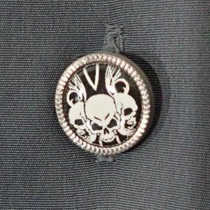 Two black vertical stripe's with embroidered ,white skull heads w/wings. Skull head, round buttons.