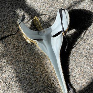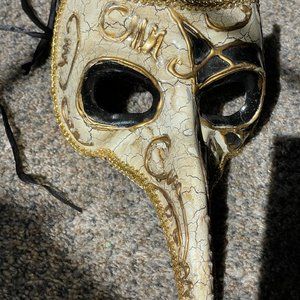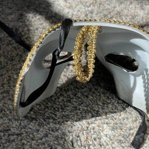 This very detailed lace back mask is gorgeous! This item is gently used yet has a real sense of elegance and sophistication. This with a tuxedo would be the perfect ''Phantom of The Opera'' costume! Have fun with it your way! enjoy!