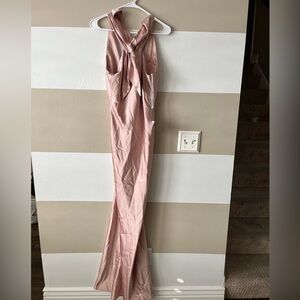 Perfect for formal gatherings and special occasions, this maxi column dress features a flowing modified trumpet skirt designed in a smooth lux charmeuse fabric. Adding an elegant touch is a draped twist halter that reveals the shoulders, reaching around for a self-tie closure. Above the revealing back keyhole rests a large sash bow that drape loosely at the back.