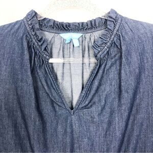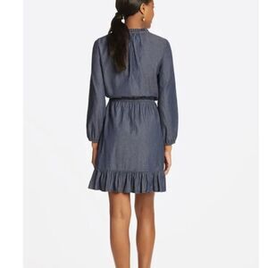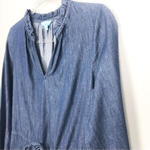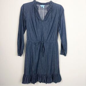 Adorable blue Jean denim dress by Draper James. V notch neckline. Long sleeves with elastic cuff with ruffle. Ruffle bottom hem. Popover style. Great condition!! Womens size extra small (XSmall).