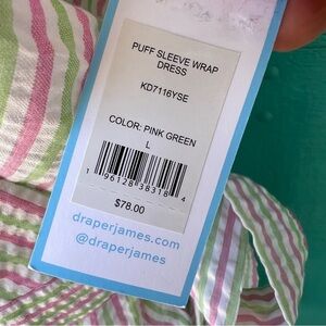 DRAPER JAMES PUFF SLEEVE WRAP DRESS PINK GREEN STRIPES SEERSUCKER SIZE LARGE NWT