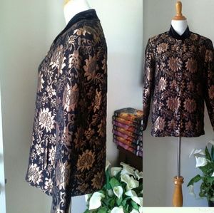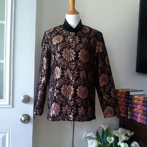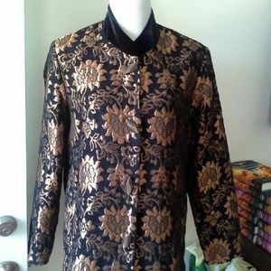 Its new never used. Fancy looking jacket in bronze and black velvety look. Front button closure. 2 pockets.