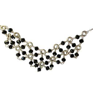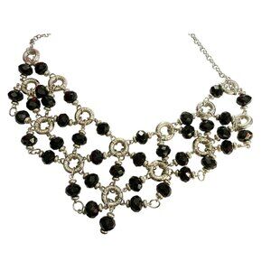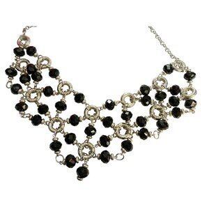 Pretty Black and Silver Tone Bib-Style Necklace. Black geometric shapes with silver tone rings entwined. Nice Style. Approx. 21" long. Very Good condition.