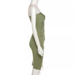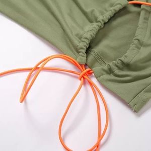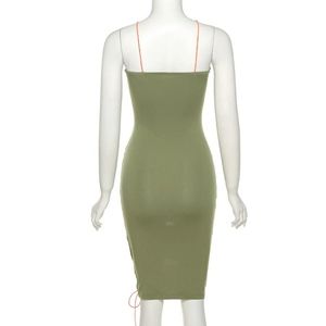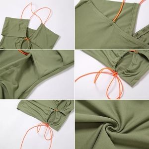 Regular dresses are so basic and blah. Err on the wild-side with this interestingly cut hollow out dress with a rope tie. Featured in a rich khaki color with a contrasting tie in a bright neon orange. Just fun!